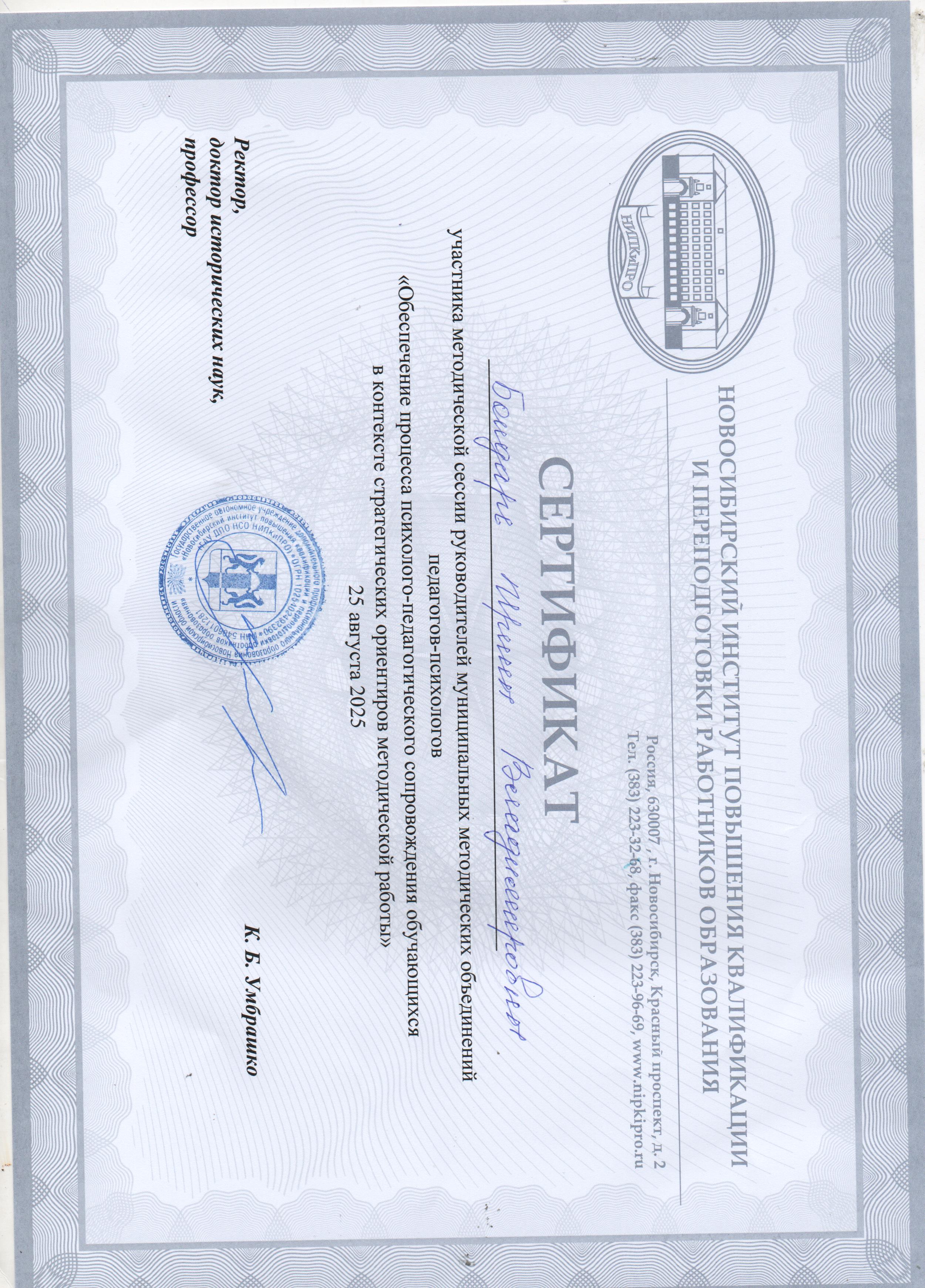 Сертификат участника методической сессии руководителей муниципальных методических объединений педагогов-психологов "Обеспечение процесса психолого-педагогического сопровождения обучающихся в контексте стратегических ориентиров методической работы"